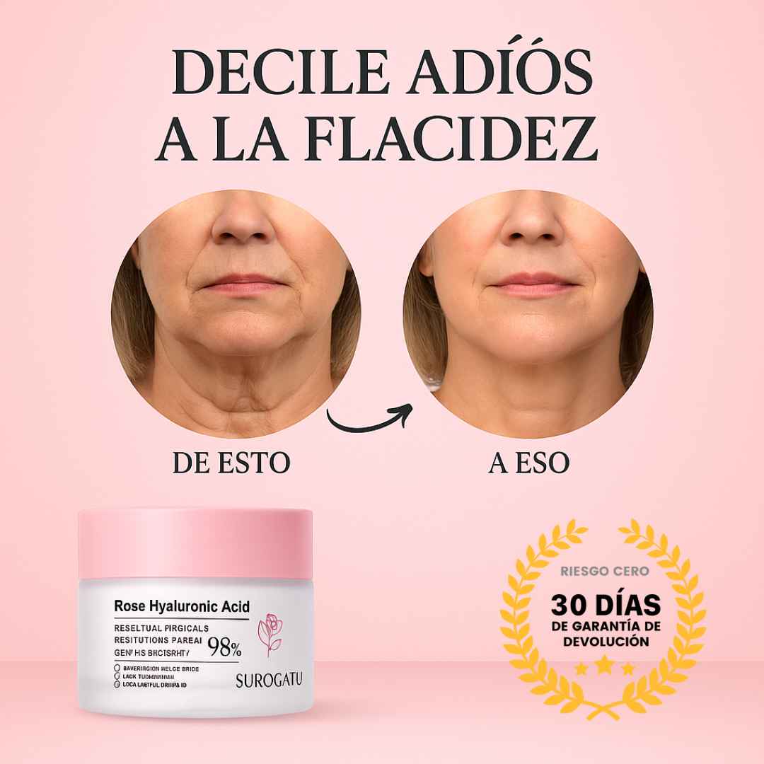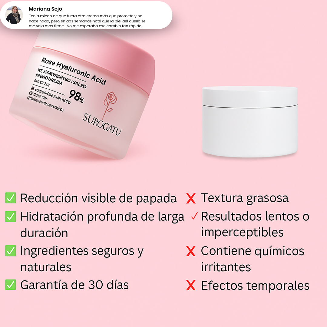 Surogatu Rose Hyaluronic Crème actúa directamente sobre la piel del cuello y mentón, ayudando a mejorar la firmeza y a reducir la apariencia de la papada de forma visible. Su fórmula con ácido hialurónico y extracto de rosa estimula la elasticidad natural de la piel, dando un efecto lifting progresivo y duradero.